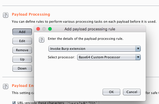 - Select the payload processing and choose Invoke Burp extension and then Base64 Custom Processor [the name which we provided in