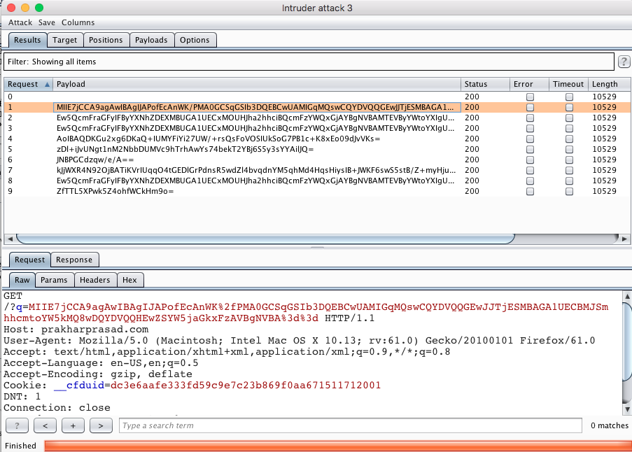 In processPayload(), when this method is invoked by Burp Suite, we’ll receive the current payload (from the list of payloads) in the currentPayload byte array. More information on the other parameters can be found in the Burp Suite API documentation. We do base64 encoding on operation on currentPayload and return the processed base64 payload, which will then be substituted by Burp Suite during the Intruder Attack run.