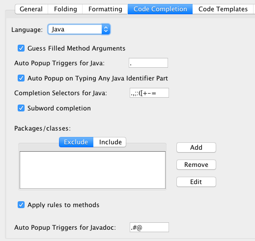 Installation of NetBeans on all platforms are straight-forward and doesn’t warrant a special section. Once installed the Auto Popup on Typing Any Java Identifier Part feature needs to be enabled. It is present under Options > Editor > Code Completion > Language > Java menu; as shown: