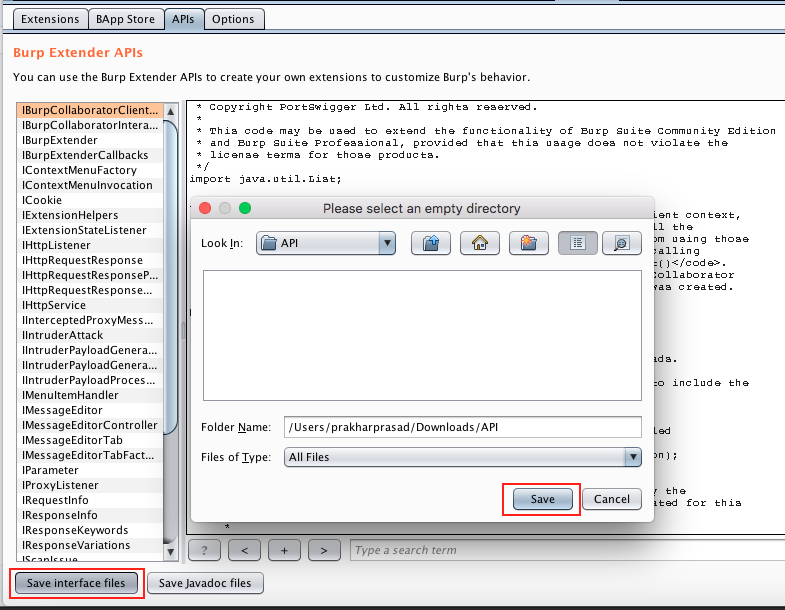 Once Burp Suite Community (or Pro) Edition is installed; we have to fire-up and reach out to the Extender tab, then from there APIs tab, and finally Save interface files to a folder.